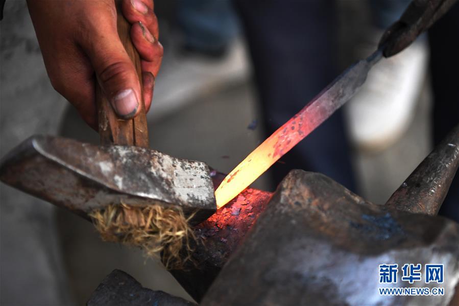 8月10日,甘肃省临夏回族自治州积石山县大河家镇的村民马有虎在制作保安腰刀。新华社记者 陈斌 摄