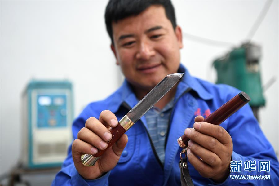 8月10日,在甘肃省临夏回族自治州积石山县大河家镇,国家级非物质文化遗产代表性项目保安族腰刀锻制技艺传承人马尕主麻在查看一把锻制好的保安腰刀。新华社记者 陈斌 摄