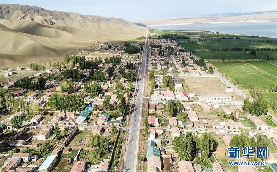 这是6月29日拍摄的新疆特克斯县也什克勒克村牧民定居点(无人机照片)。 天山深处的也什克勒克村变了,变得连生活在这里的500余户牧民都不敢相信。千里牧野,金色村庄,让牧区彻底改变的是当地连续施行的绣花式就业扶贫。 新华社记者 王菲 摄