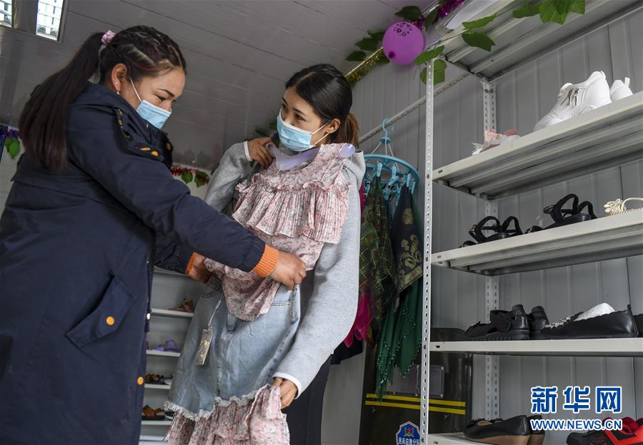 在新疆特克斯县也什克勒克村贫困户就业富民市场内,服装店经营者、贫困户赛力克古丽·吐尔逊巴伊(左)在帮顾客挑选衣服(6月29日摄)。 天山深处的也什克勒克村变了,变得连生活在这里的500余户牧民都不敢相信。千里牧野,金色村庄,让牧区彻底改变的是当地连续施行的绣花式就业扶贫。 新华社记者 王菲 摄