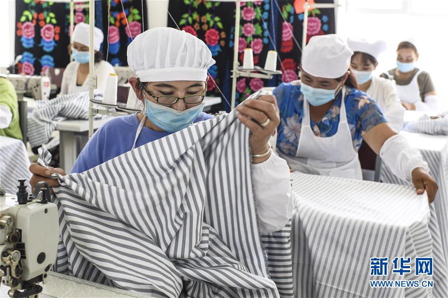 在新疆特克斯县也什克勒克村刺绣合作社内,村民在制作纺织品(7月3日摄)。 天山深处的也什克勒克村变了,变得连生活在这里的500余户牧民都不敢相信。千里牧野,金色村庄,让牧区彻底改变的是当地连续施行的绣花式就业扶贫。 新华社记者 王菲 摄