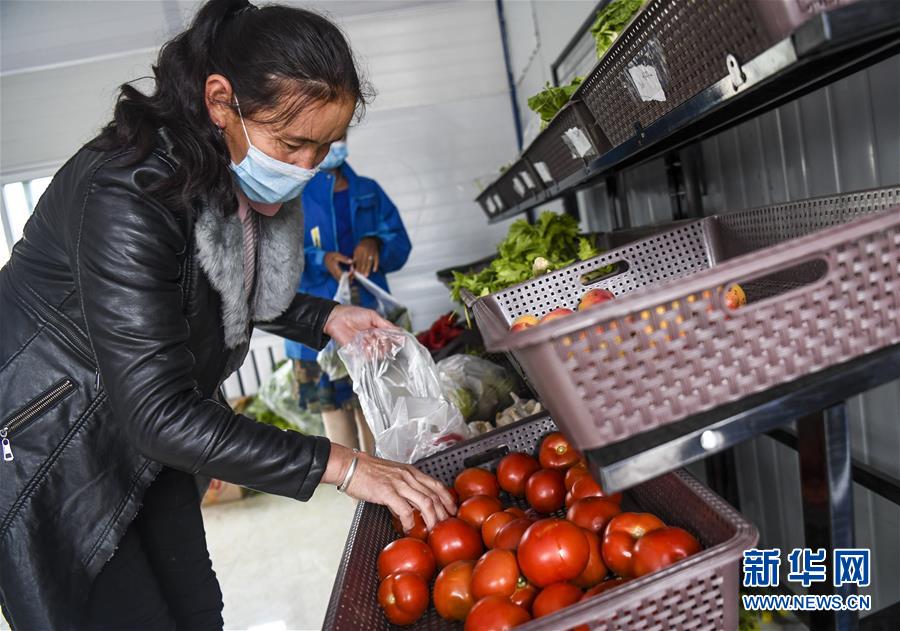 在新疆特克斯县也什克勒克村贫困户就业富民市场内,村民在蔬菜店挑选蔬菜(6月29日摄)。 天山深处的也什克勒克村变了,变得连生活在这里的500余户牧民都不敢相信。千里牧野,金色村庄,让牧区彻底改变的是当地连续施行的绣花式就业扶贫。 新华社记者 王菲 摄