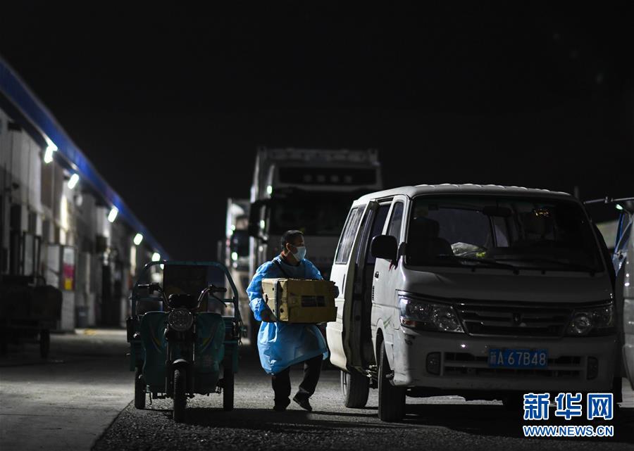 在新疆九鼎农产品批发交易市场里,陈金奇将采购好的蔬菜搬运至面包车上(8月8日摄)。新华社记者 赵戈 摄