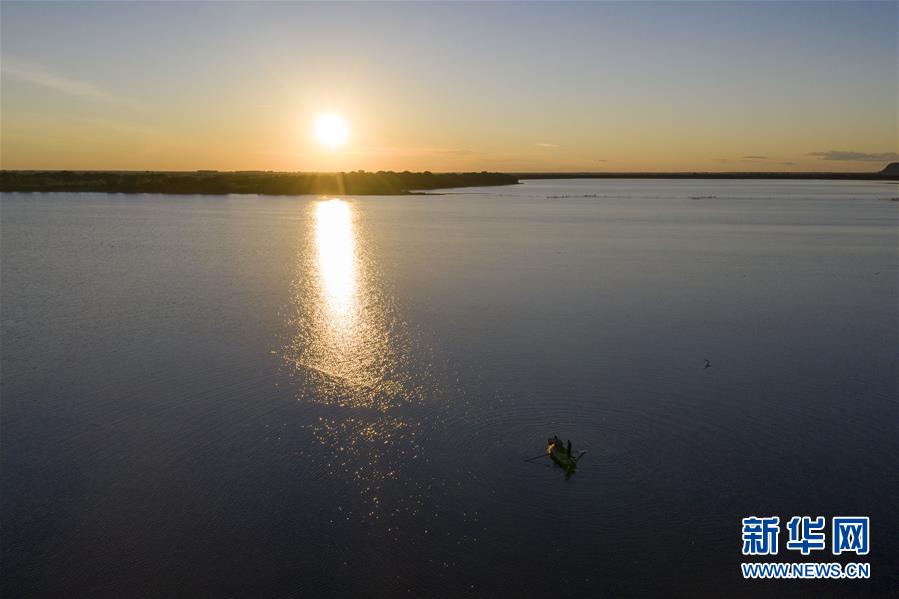 7月24日,渔民在大力加湖中捕鱼(无人机照片)。大力加湖面积28.5平方公里,两岸地势低平,多湿地、草原,湖内水产丰富。新华社记者 谢剑飞 摄