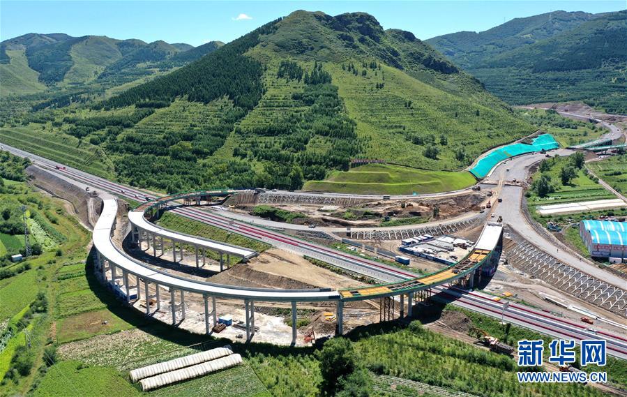 这是8月10日拍摄的施工中的延崇高速河北段延伸工程第四标段张家口市崇礼白旗互通枢纽(无人机照片)。