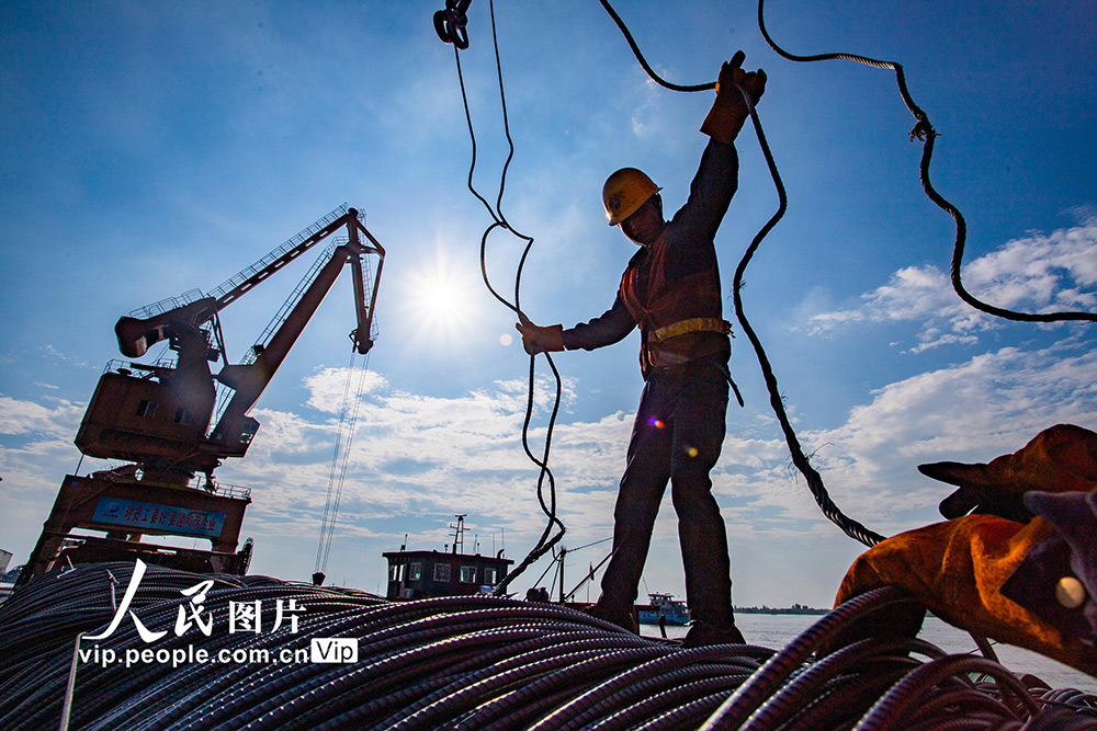8月11日,天气持续晴热高温,江西湖口沿江钢铁码头更是开启“烧烤”模式,码头工人在做好各项降温防暑措施前提下,战高温、斗酷暑,坚守在岗位一线。张玉/人民图片