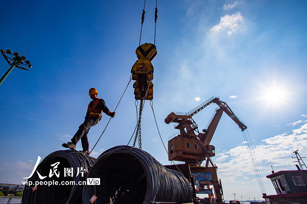 8月11日,天气持续晴热高温,江西湖口沿江钢铁码头更是开启“烧烤”模式,码头工人在做好各项降温防暑措施前提下,战高温、斗酷暑,坚守在岗位一线。张玉/人民图片
