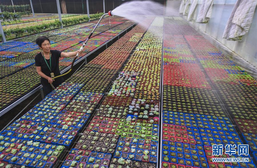 8月12日,河北省安平县大何庄乡育华农场的农民在给多肉盆栽浇水。 近年来,河北省安平县调整农业产业结构,依托温室大棚发展“鲜花经济”。种植户结合市场需求,生产鲜花用于家居、婚庆及各类节庆装饰,有效促进农业增效和农民增收。截至目前,安平县温室花卉种植面积近千亩。 新华社记者 李晓果 摄