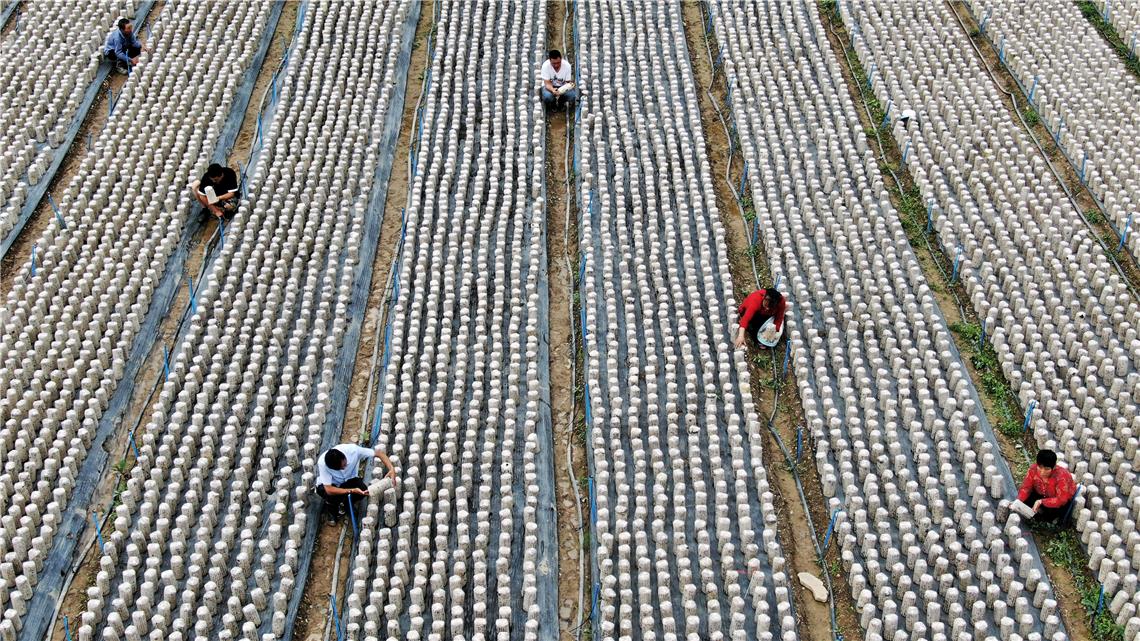 8月10日,宕昌县好梯乡麻子沟扶贫产业园内,管理人员查看黑木耳长势。(无人机拍摄)