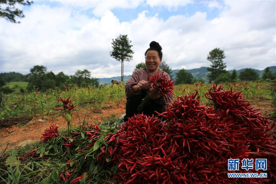 8月12日,在贵州省剑河县久仰镇摆尾村辣椒种植基地,农户在采收辣椒。 近年来,贵州省黔东南苗族侗族自治州剑河县因地制宜,加大农业产业结构调整,扩大辣椒等特色产业种植,采取“公司+种植基地+农户”订单种植模式,帮助当地群众持续增收。 新华社发(杨家孟 摄)