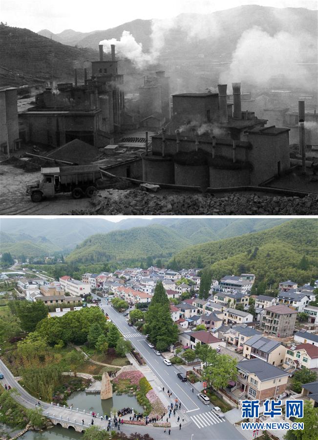 这是一张拼版照片,上图为:浙江省湖州市安吉县天荒坪镇余村1980年代的资料照片;下图为:2018年4月24日,游客在整修一新的余村游览拍照(新华社记者翁忻旸摄)。新华社发