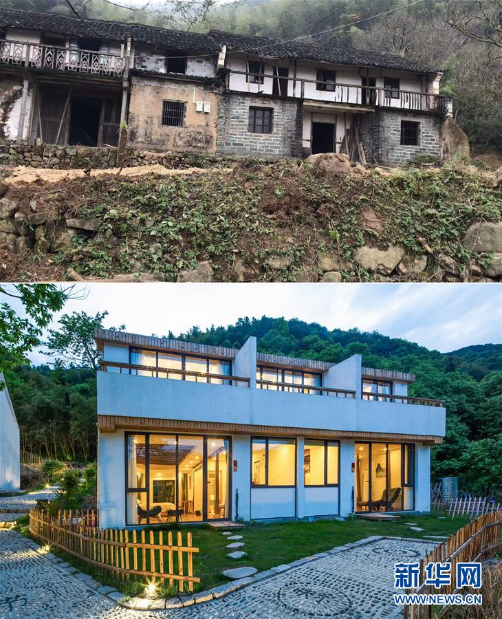 拼版照片:浙江上虞青山村的沐格山居精品民宿改造前和改造后的对比照片(资料照片)。该民宿由14户农户的9幢荒废破旧老房改建。新华社发