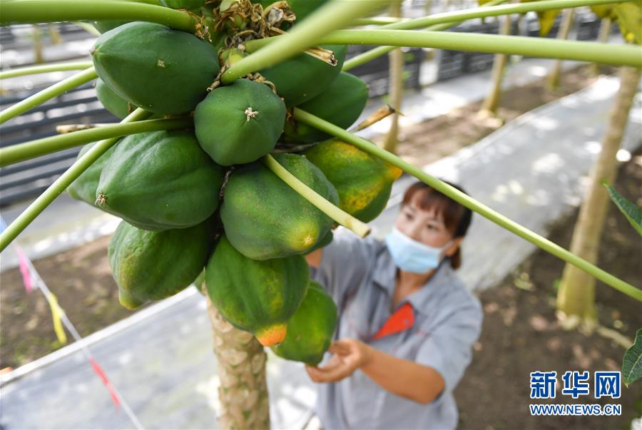 在吉林省永吉县万昌镇宇丰红果木瓜产业园,工作人员在大棚内管护木瓜(8月12日摄)。近年来,吉林省永吉县万昌镇积极优化农业产业结构,推进农业生态观光采摘园建设,引进木瓜、香蕉等热带果品发展“南果北种”,助当地农民开启一条致富新路。 新华社记者 许畅 摄
