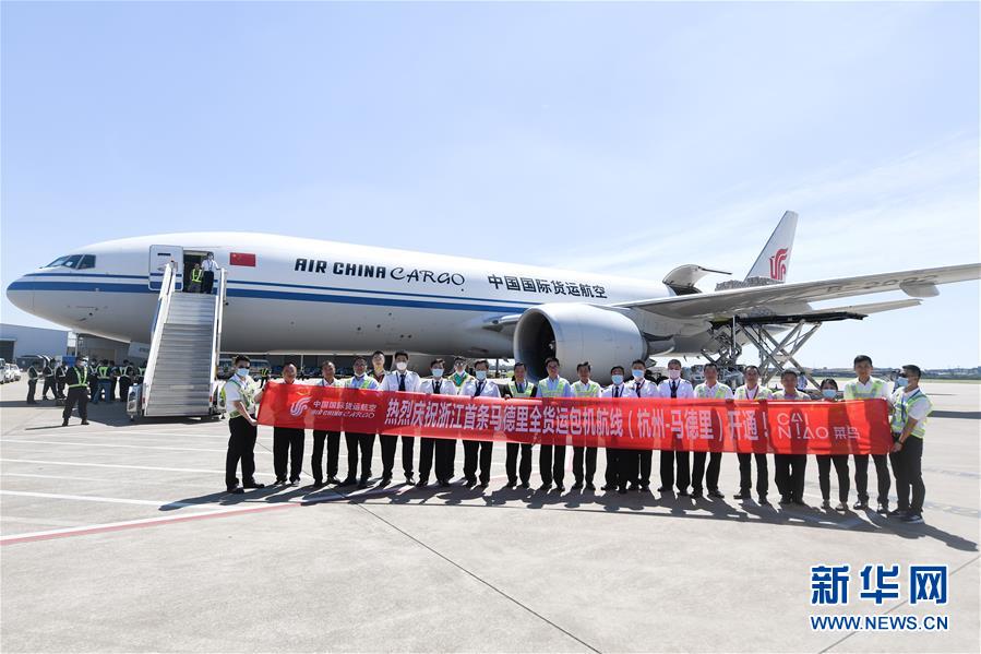 8月13日,嘉宾与机组人员在杭州萧山国际机场出席航线开通仪式。新华社记者 黄宗治 摄