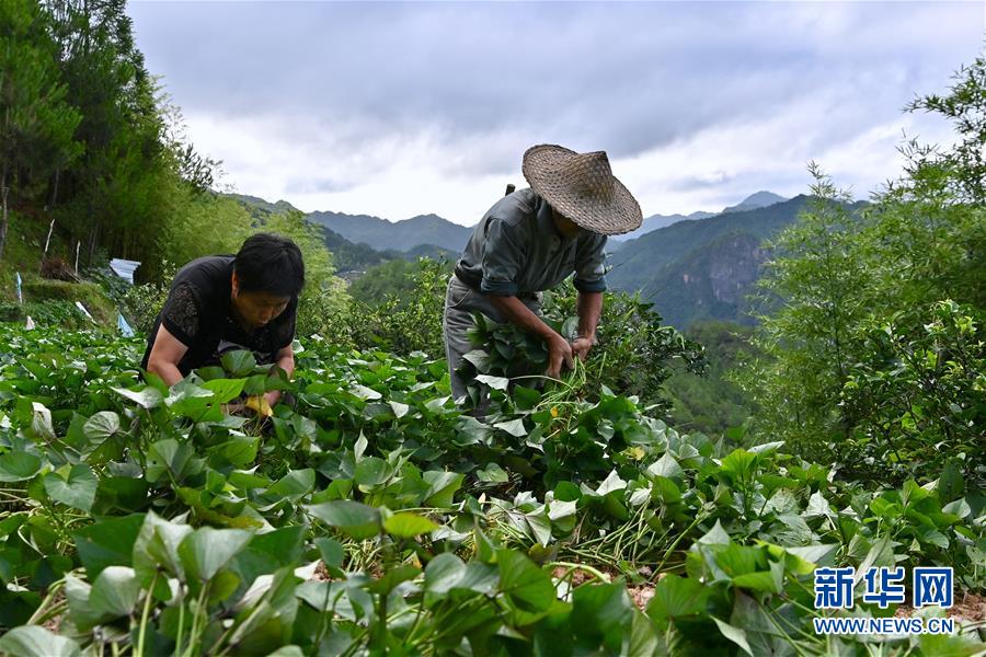 8月3日,陈峭村村民在地瓜梯田里劳作。 新华社记者 姜克红 摄