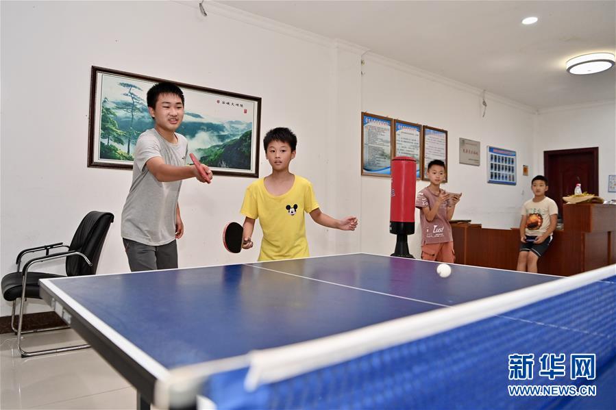 8月2日,小朋友在陈峭村旅游服务中心内打乒乓球。 新华社记者 姜克红 摄