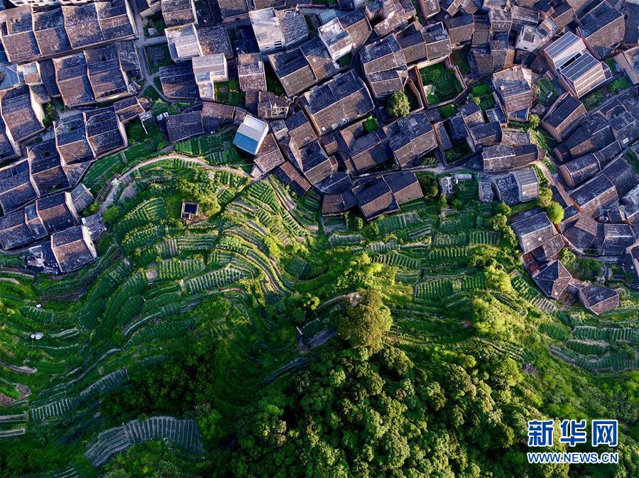 陈峭村古民居与后山的梯田融为一体(无人机照片,8月2日摄)。 新华社记者 姜克红 摄
