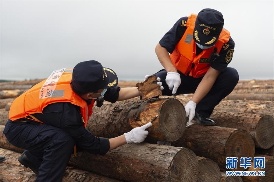 8月13日,在黑龙江抚远口岸货检现场,工作人员对进境木材进行检疫查验。