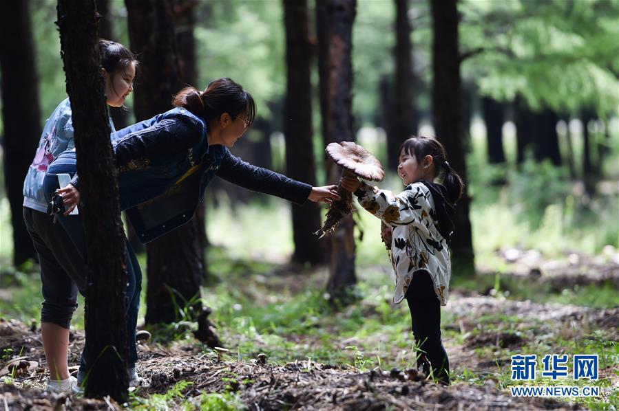 8月13日,游客在内蒙古克什克腾旗桦木沟林场种植基地采摘大球盖菇。 近日,内蒙古克什克腾旗桦木沟林场的大球盖菇长势喜人,工人们在密林间忙着采摘。这是当地林场与青岛农业大学于2018年起开始合作的食用菌林下种植试验项目,目前这里的大球盖菇亩产能达4000斤以上,还吸引了许多游客来体验林中蘑菇采摘。今年,该试验项目已经小规模推广到林场周边乡镇,林下种菌使老林区有了新活力,带动了林区居民增收。 新华社记者 刘磊 摄