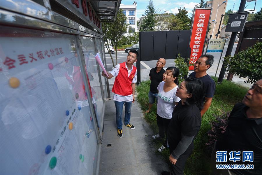 8月13日,在杭州市临安区岛石镇岛石村的村务公开栏,党员志愿者给村民讲解村务公开的各项具体内容。新华社记者 徐昱 摄
