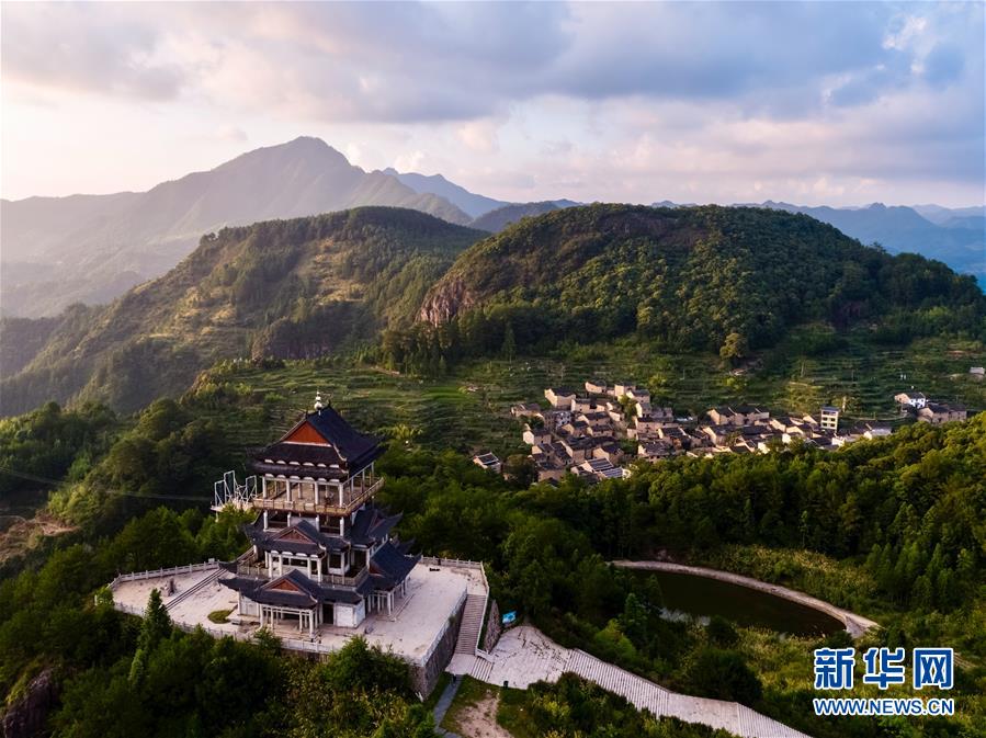 8月2日,夕阳映照着陈峭村古民居和聚贤阁观景台(无人机照片)。 新华社记者 姜克红 摄
