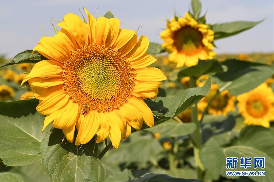 这是8月13日在景泰县寺滩乡拍摄的向日葵花海。 初秋时节,位于甘肃省白银市景泰县寺滩乡的十万亩向日葵竞相绽放,金黄的葵花张开“笑脸”,迎接丰收。据介绍,当地近年来按照“标准化生产、规模化经营、企业化管理、品牌化运作”的现代农业发展理念,依托集中连片、平坦开阔的旱砂地资源,在寺滩乡建设食葵标准化生产基地,现种植面积已达十万亩,初步形成集种植、加工、科技、观光于一体的国家现代农业产业园。 新华社记者 范培珅 摄