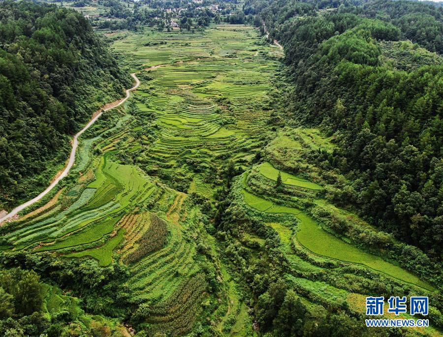 这是8月13日拍摄的鞍子镇大林村梯田景色(无人机照片)。 时下,重庆市彭水苗族土家族自治县鞍子镇大林村的梯田景色迷人,构成一幅幅山乡田园美景。 新华社记者 王全超 摄