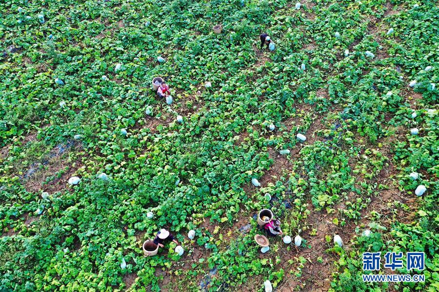 8月12日,农民在贵州省思南县许家坝镇双坝坝区收获冬瓜(无人机照片)。 近日,贵州省铜仁市思南县许家坝镇双坝坝区种植的南瓜、冬瓜陆续成熟,农民忙着采收、搬运、销售,田间地头一派忙碌的丰收景象。近年来,思南县积极推进19个500亩以上坝区建设,采取“龙头企业+合作社+农户”的发展模式,发展蔬菜、红薯、精品水果、中药材等坝区产业,帮助农民就近就业增收。 新华社记者 杨文斌 摄