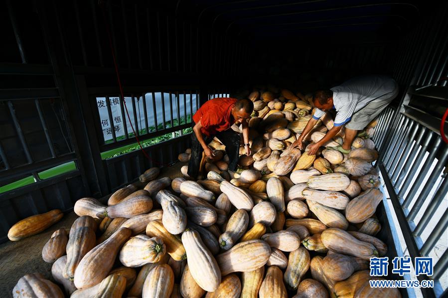 8月12日,农民在贵州省思南县许家坝镇双坝坝区将收获的南瓜装车。 近日,贵州省铜仁市思南县许家坝镇双坝坝区种植的南瓜、冬瓜陆续成熟,农民忙着采收、搬运、销售,田间地头一派忙碌的丰收景象。近年来,思南县积极推进19个500亩以上坝区建设,采取“龙头企业+合作社+农户”的发展模式,发展蔬菜、红薯、精品水果、中药材等坝区产业,帮助农民就近就业增收。 新华社记者 杨文斌 摄