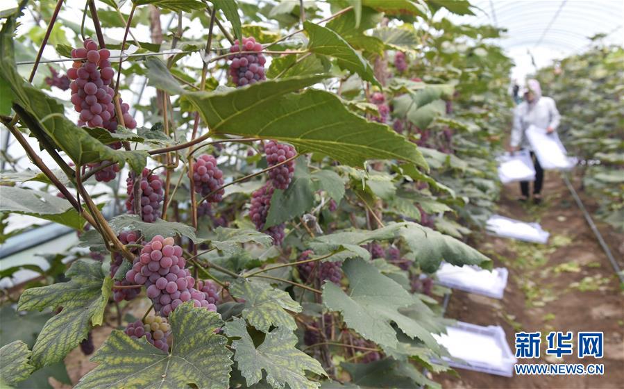 这是8月13日在吉林省磐石市烟筒山镇民主村葡萄大棚内拍摄的葡萄。 时下,吉林省磐石市烟筒山镇棚膜葡萄园区内的大棚葡萄进入采摘季,农民喜获丰收。近年来,当地通过“共创”与“扶持”相结合的模式大力发展特色农业,建设葡萄种植大棚300余栋,以此带动村集体经济发展,助力农民增收致富。 新华社记者 许畅 摄
