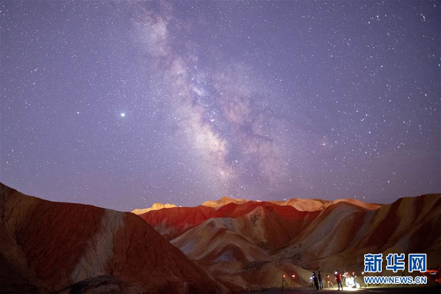 8月12日夜间,天文爱好者在甘肃省张掖七彩丹霞地质公园拍摄英仙座流星雨(长时间曝光照片)。新华社发(钟晓亮 摄)