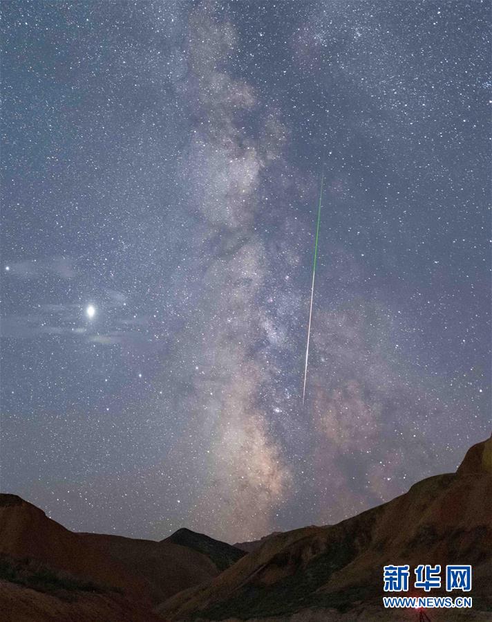 这是8月13日凌晨在甘肃省张掖七彩丹霞地质公园中拍摄的英仙座流星雨(长时间曝光照片)。新华社发(钟晓亮 摄)