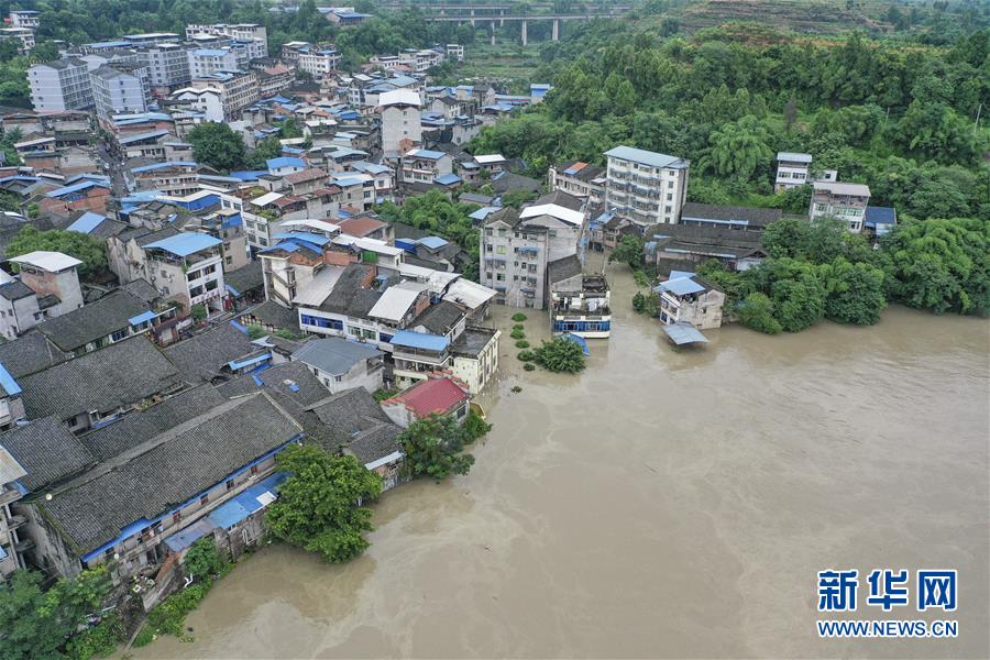 8月13日,在重庆市潼南区玉溪镇,涪江水位明显上涨,洪水倒灌进场镇(无人机照片)。 受上游强降雨影响,嘉陵江近日出现明显涨水过程,“嘉陵江2020年第1号洪水”已在嘉陵江支流涪江形成。重庆市正式启动洪水防御Ⅱ级应急响应。 据初步统计,截至13日16时30分,位于涪江畔的重庆市潼南区,沿涪江7个镇街不同程度受灾,受灾人数8209人,转移人口6658人,农作物受灾面积5579亩。 新华社记者 黄伟 摄