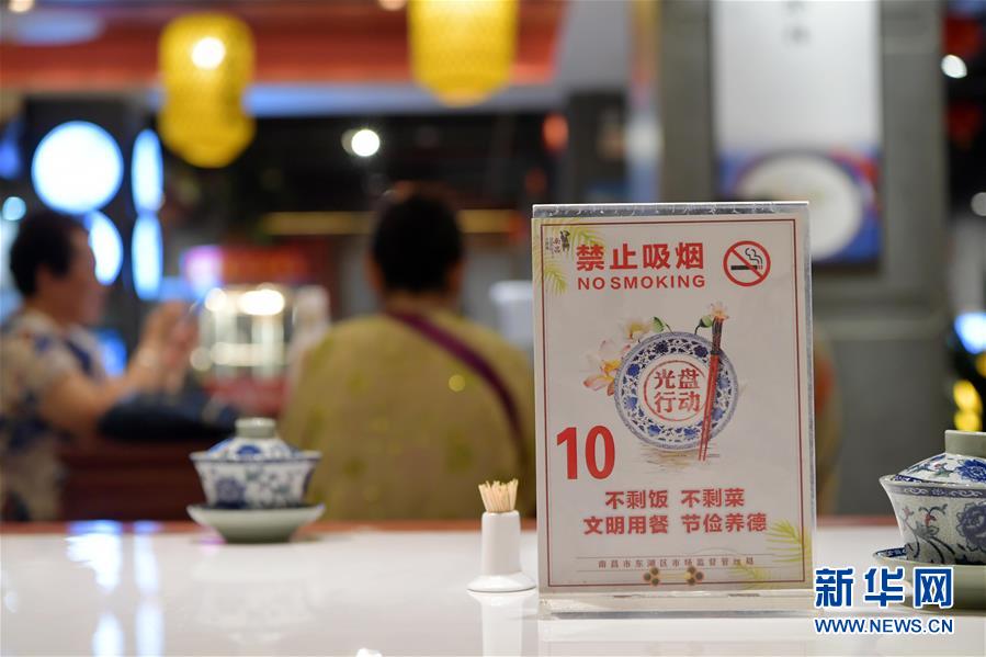 8月15日,顾客在南昌市东湖区一家饭店就餐,餐桌上摆放着“文明用餐”的提示牌。 新华社记者 彭昭之 摄