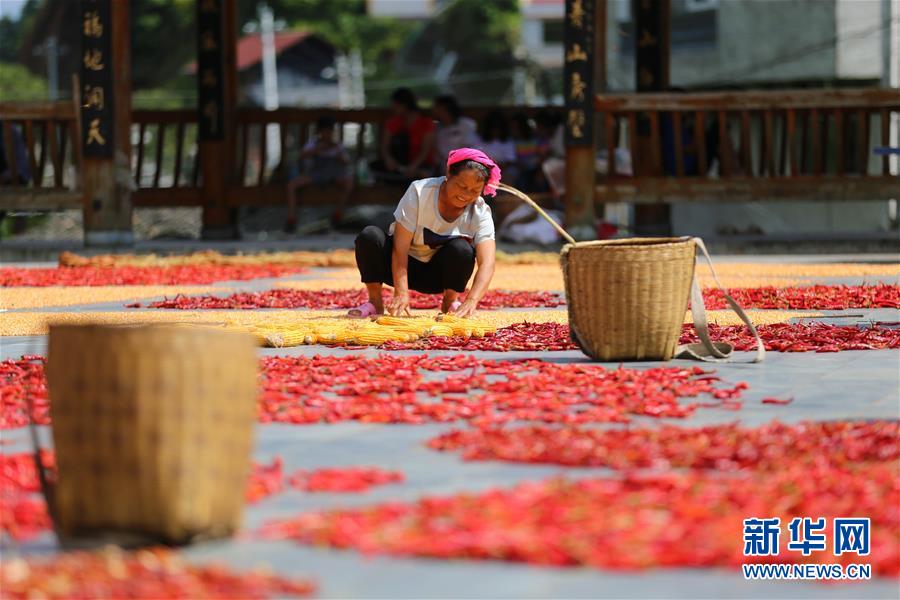 8月15日,贵州省锦屏县大同乡秀洞村村民在晾晒玉米。 近日,在贵州省黔东南苗族侗族自治州锦屏县的村寨中,村民利用晴好天气晾晒红辣椒、玉米等农作物,晒场犹如一幅美丽的“晒秋图”。 新华社发(杨晓海 摄)