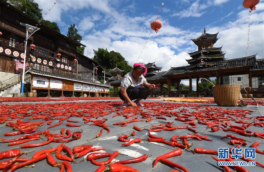 8月15日,贵州省锦屏县大同乡秀洞村村民在晾晒红辣椒。 近日,在贵州省黔东南苗族侗族自治州锦屏县的村寨中,村民利用晴好天气晾晒红辣椒、玉米等农作物,晒场犹如一幅美丽的“晒秋图”。 新华社发(杨晓海 摄)