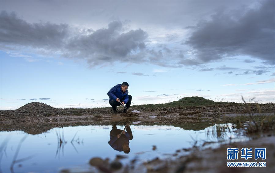 8月15日,长江科学院的科考队员孙宝洋在楚玛尔河采集土样。 新华社记者 吴刚 摄