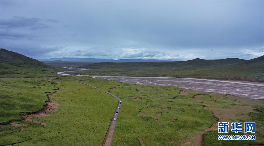 8月14日,科考车辆在青海省玉树藏族自治州治多县索加乡行进(无人机照片)。 新华社记者 吴刚 摄