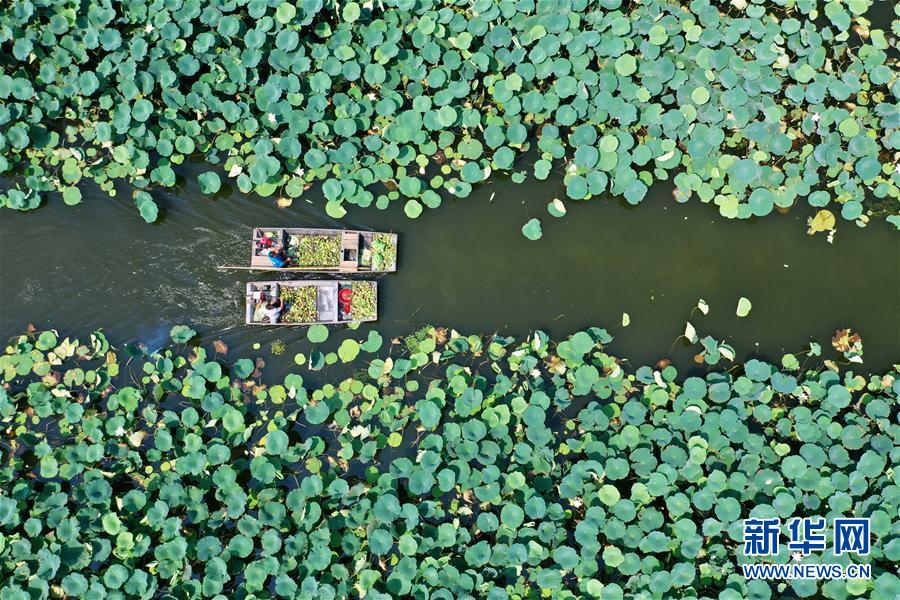 8月17日,江苏省宿迁市泗洪县临淮镇村民在洪泽湖采收莲蓬(无人机照片)。