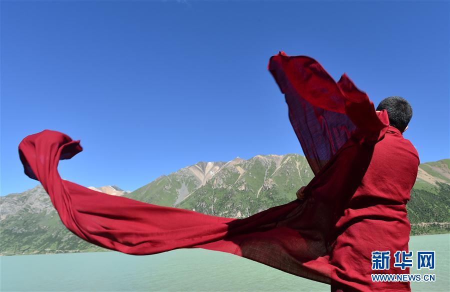 8月17日,一名僧人在嘉乃玉错湖边。 嘉乃玉错国家湿地公园位于西藏自治区那曲市嘉黎县境内。嘉乃玉错湖边铺满鲜花、草木,牛马悠闲觅食。 新华社记者 觉果 摄