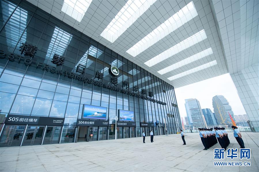 8月17日,澳门特区政府治安警察局人员在横琴口岸澳门口岸区前列队。 当日,珠海出入境边防检查总站与澳门特区政府治安警察局在横琴口岸新旅检区域联合开展全真实环境下的勤务组织和模拟通关实战演练,全力保障8月18日横琴口岸新旅检区域顺利开通、顺畅运行。 新华社记者 张金加 摄