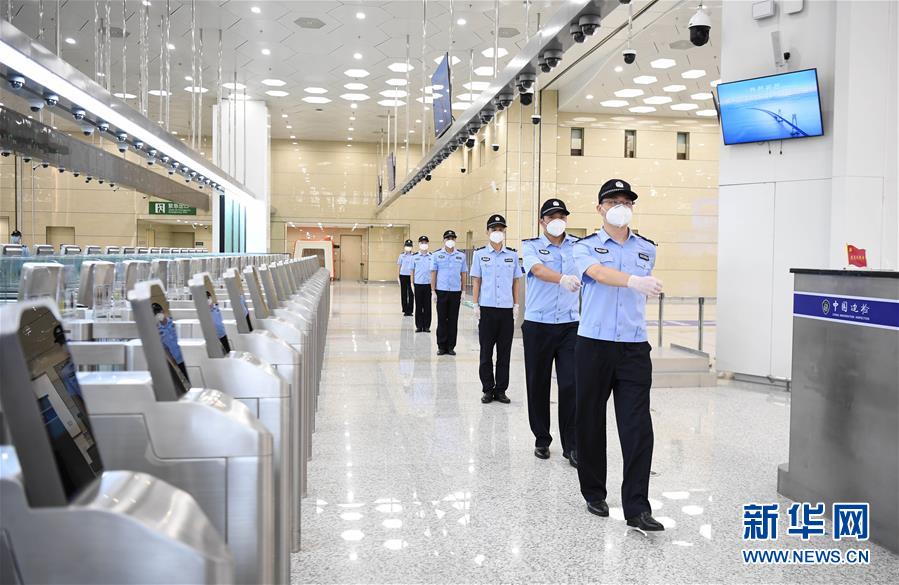 8月17日,珠海出入境边防检查总站人员在横琴口岸模拟通关演练中。 当日,珠海出入境边防检查总站与澳门特区政府治安警察局在横琴口岸新旅检区域联合开展全真实环境下的勤务组织和模拟通关实战演练,全力保障8月18日横琴口岸新旅检区域顺利开通、顺畅运行。 新华社记者 邓华 摄