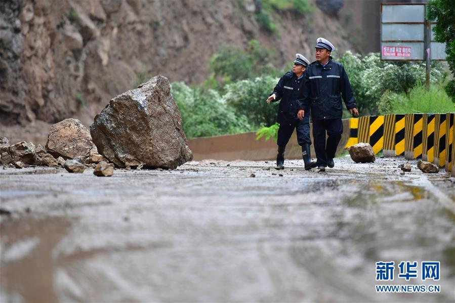 8月17日,陇南市公安局交警支队武都大队民警在国道212线塌方路段查看险情。 新华社记者 陈斌 摄