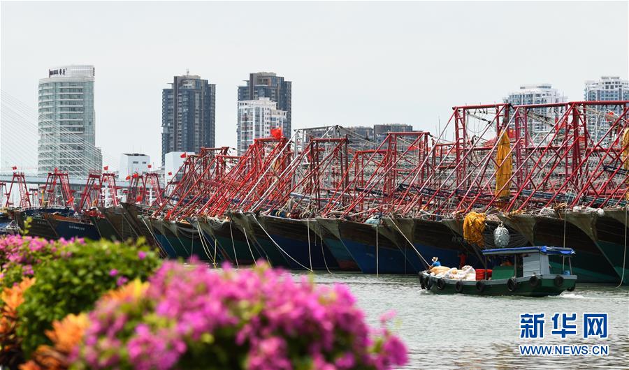 8月18日,渔船在海口市新港码头内停靠避风。 当日8时,位于南海东北部海面的热带低压加强为今年第7号台风“海高斯”,这是8月以来登陆我国的第三个台风,海口附近海域不少船舶来到海口市新港码头内停靠避风,确保安全。 新华社记者 杨冠宇 摄