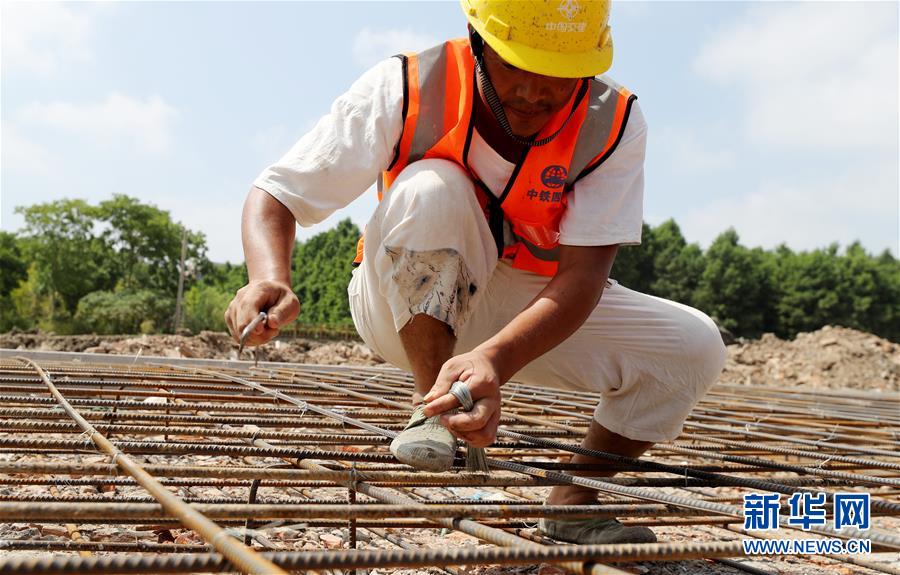 8月18日,一名工人在张江站工地对路基钢筋进行加固。 新华社记者 方喆 摄