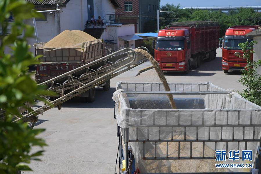 8月18日,收购的早籼稻在江西省南昌县广福粮食管理所广福粮站被分车装载,准备运往储存点储存。 新华社记者 彭昭之 摄
