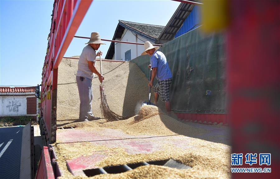 8月18日,江西省南昌县广福粮食管理所广福粮站的工作人员将早籼稻卸下货车,准备收购归仓。 新华社记者 彭昭之 摄