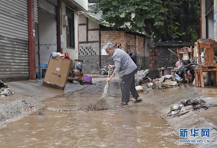 8月18日,洪水过后,雅安市雨城区草坝镇居民在清理巷内淤泥。 当日5时,四川启动I级防汛应急响应,这是有记录以来,四川首次启动该响应。预计整个青衣江流域洪水将全面超过保证水位,大渡河下游、岷江下游也将出现全面超警超保洪水,防汛形势十分严峻。 新华社记者 刘坤 摄