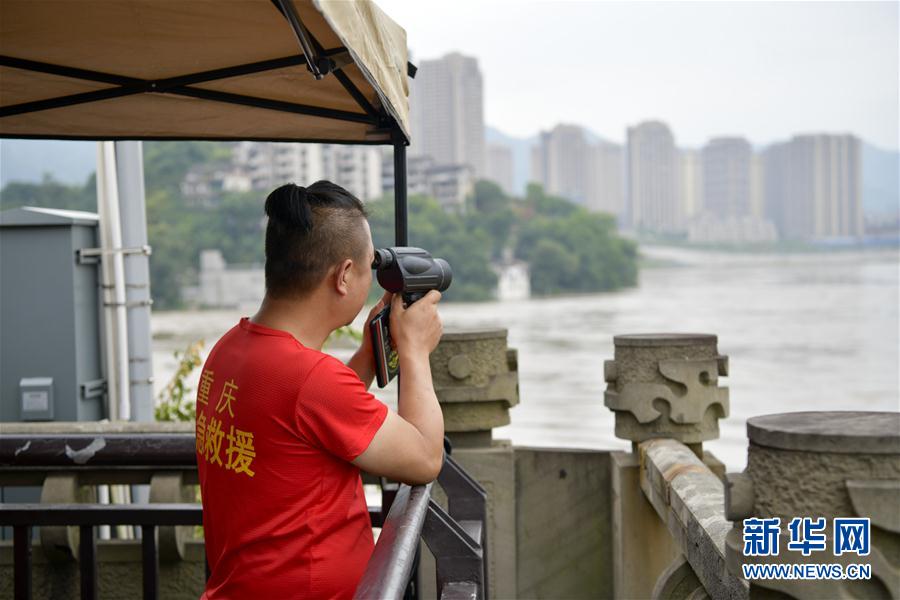 8月18日,重庆市沙坪坝区磁器口街道的应急救援人员在磁器口古镇旁的一个观测点值守。 新华社记者 刘潺 摄