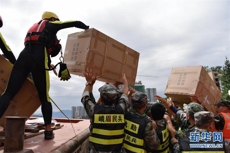 8月18日,在乐山市市中区,救援人员将救援物资运送上船。 8月17日晚,受持续强降雨影响,四川青衣江现百年一遇洪水。8月18日中午,洪峰过境四川省乐山市,一千多名群众被困市中区凤洲岛上,救援人员紧急前往现场转移被困群众,截至18时已安全转移513人。 新华社记者 胥冰洁 摄